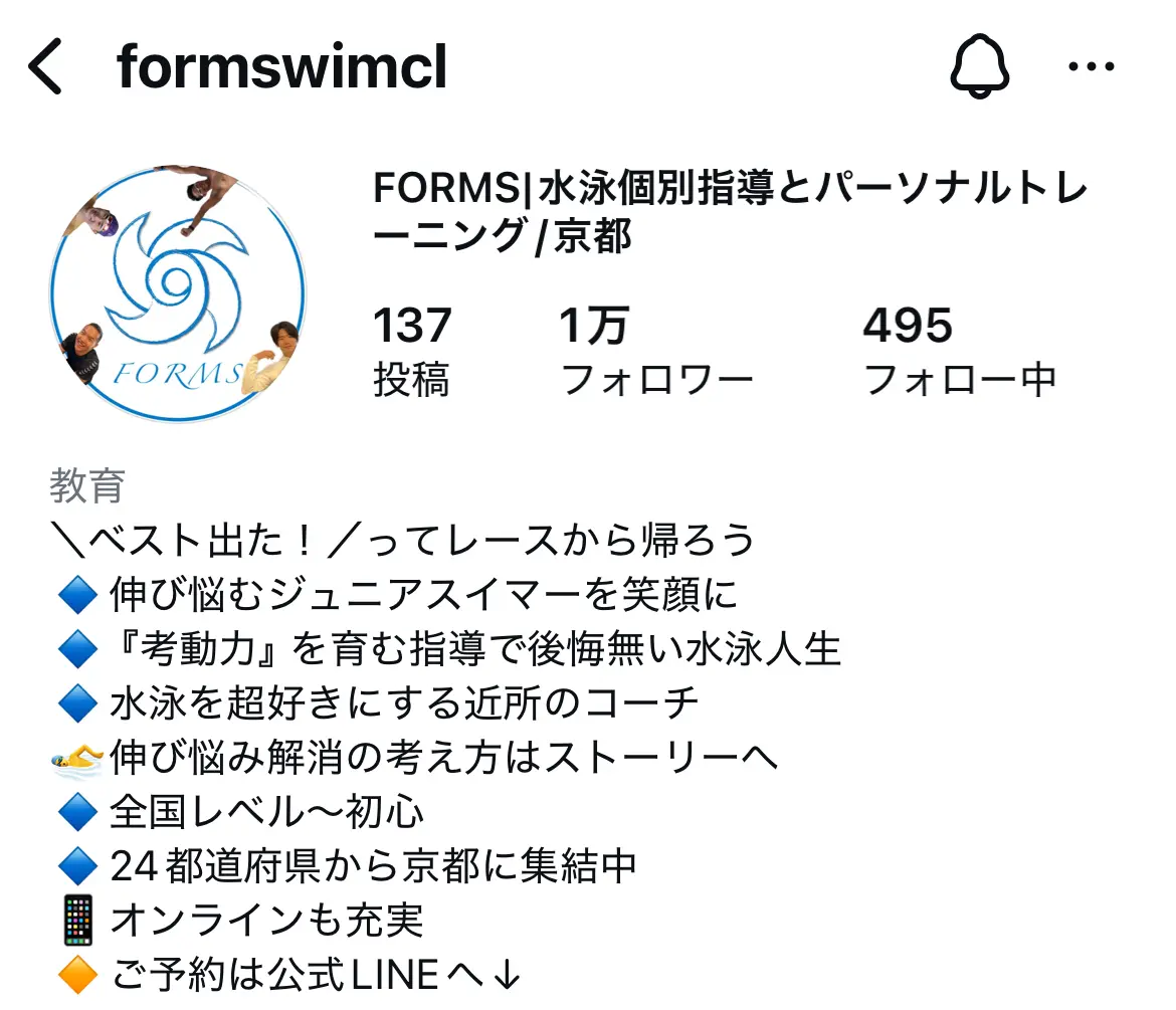 京都府・京都市・大阪府(一部)を中心に水泳の個別指導を行っている水泳個別指導FORMSです。2018年より活動を開始し、皆様の「ありがとう」に支えられています。経験と知識、長年の水泳経験を生かしながら指導しております。